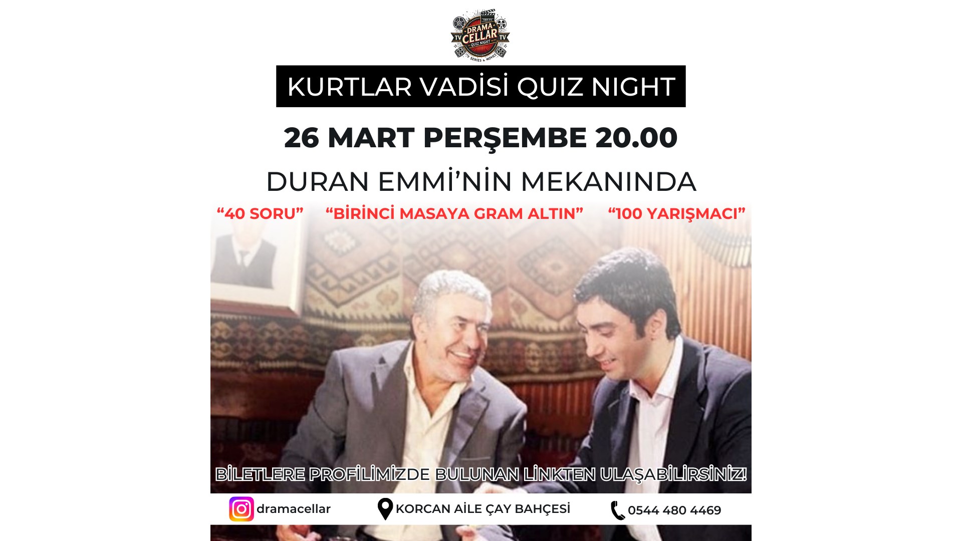 KURTLAR VADİSİ QUIZ NIGHTKENDİ GÜNÜNDE, KENDİ SAATİNDE, KENDİ MEKANINDA!26 MART PERŞEMBE 20.00'DA DURAN EMMİ'NİN MEKANINDA!ŞAMPİYON MASAYA GRAM ALTIN!Quiz Night etkinliğimiz; katılmayı seçtiğiniz etkinlik ile alakalı özenle hazırlanmış 40 adet klasik sorudan oluşuyor.Sorularımız moderatörümüz tarafından okunuyor ve verilen süre içerisinde sizden önünüzdeki tahtalara cevaplarınızı yazıp süre...